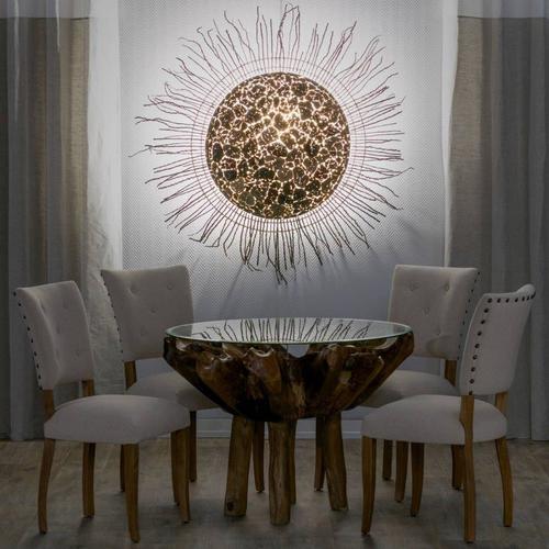 7. Indonezyjska lampa ścienna Matahari o niekonwencjonalnej formie. Zewnętrzna tarcza stworzona jest z gałęzi, natomiast w środku umieszczone zostały kawałki gliny. Lampa zarazem intryguje i zachwyca.