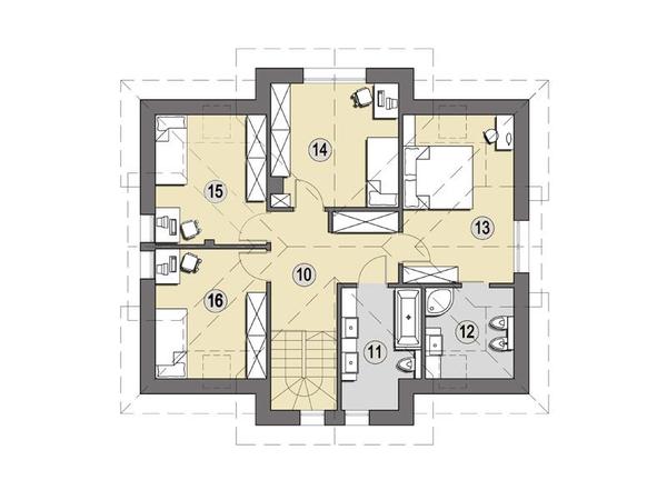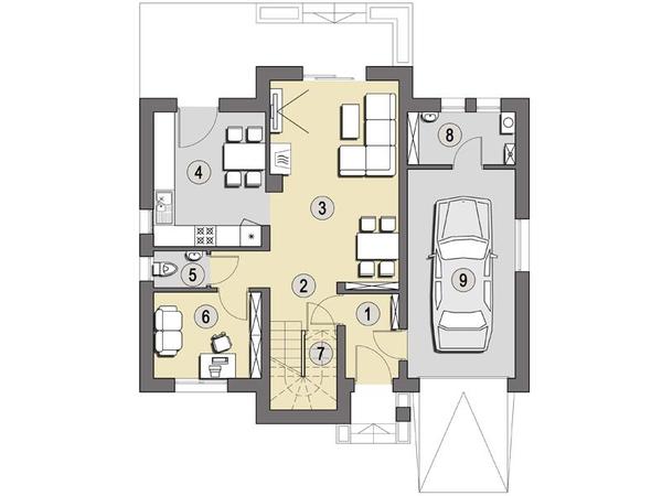 Opis:Dom salvador zaprojektowano na rzucie zbliżonym do kwadratu. Charakteryzuje się tradycyjną architektura, połączoną z nowoczesnym rozwiązaniem układu wnętrza. Dom z poddaszem użytkowym, niepodpiwniczony, z wbudowanym garażem. Przeznaczony dla 4-5 osobowej rodziny. Na parterze domu z centralnie usytuowanym holem mamy dostęp do wszystkich pomieszczeń: salonu z kominkiem, jadalni, kuchni, pokoju gościnnego i toalety. Ponadto, na parterze budynku znajduje się garaż z pomieszczeniem gospodarczym. W holu znajdują się schody prowadzące na poddasze, doświetlone światłem dziennym. Na poddaszu zaprojektowano cztery sypialnie oraz łazienkę. Sypialnia rodziców posiada osobną łazienkę.