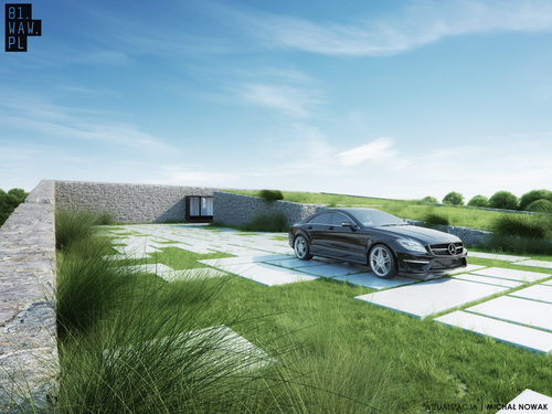 Od strony podjazdu ulokowano wejście do domu. Jest ono nieco schowane i niewidoczne na pierwszy rzut oka. Taki zabieg był możliwy dzięki zastosowaniu kamiennego murku „wyrastającego” z ziemi. W centralnej części, vis-a-vis wejścia, znajduje się garaż z zielonym dachem, który także otaczają wyrastające z ziemi mury. Takie rozwiązania tworzą dookoła domu atmosferę intymności i częściowej izolacji od strony ulicy, na której tak zależało mieszkańcom. Przed głównym wejściem zlokalizowano okazały podjazd, który umożliwia łatwy wjazd do garażu, a także stanowi doskonałe miejsce parkingowe dla samochodów gości. Garaż wraz z kotłownią i pomieszczeniami technicznymi znajduje się w przedniej bryle budynku i został odseparowany od części dziennej domu.