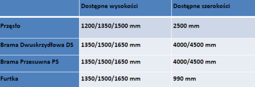 W skład Systemu Uniwersalnego wchodzą pasujące do siebie: brama przesuwna i dwuskrzydłowa, furtka, przęsła, słupki oraz akcesoria dodatkowe z kompletem elementów montażowych. Do wyboru są trzy wysokości przęseł (1200, 1350 i 1500 mm) oraz trzy wysokości bram i furtek (1350, 1500 i 1650 mm). Szerokość przęsła to 2500 mm, a furtki – 990 mm. Można zdecydować się na bramę przesuwną albo dwuskrzydłową, które występują w dwóch szerokościach (4000 lub 4500 mm). Składowe systemu da się ze sobą dowolnie zestawiać, łącząc za pomocą słupów o przekroju 60x60, 80x80 lub 100x100 mm. Całość uzupełniają opcjonalne elementy potrzebne do montażu automatyki, napęd oraz domofon, które zwiększają funkcjonalność ogrodzenia. Wszystkie części systemu dostępne są w trzech kolorach: czarnym (RAL 9005), antracytowym (7016) i zielonym (6005).