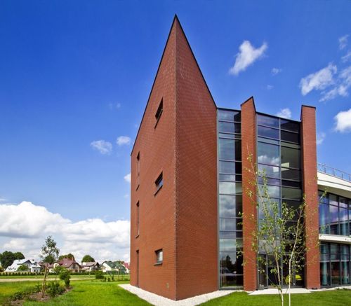 Elewacja na miarę czasówW tej części hotelu, gdzie bryła zbliżona jest kształtem do prostopadłościanu, na elewacji króluje cegła klinkierowa, a w strefie, gdzie bryła „gnie się” i zakręca – szkło. W ten ciekawy sposób architekci podkreślili podział na masywniejszą, bardziej klasyczną formę jednego skrzydła oraz nowoczesną, zakrzywioną linię drugiego skrzydła obiektu. Zarówno sama bryła, jak i zastosowane materiały odzwierciedlają wysmakowanie i prestiż obiektu. Efektowne zestawienie tafli szkła z klinkierem na elewacji nie byłoby możliwe bez odpowiednich materiałów. Do budowy hotelu Blue Diamond wykorzystano ok. 60 tysięcy sztuk cegieł Melbourne czerwonych gładkich NF. To jedna z większych realizacji z cegieł klinkierowych marki Röben w regionie podkarpackim.