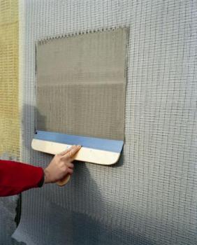 W świeżą i o równej grubości warstwę zaprawy zbrojącej wtapiamy siatkę z włókna szklanego (od góry ku dołowi) na całej wysokości ściany. Pamiętamy, aby siatka była naciągnięta, bez zgięć oraz z zakładem 10 cm. Prawidłowo zatopiona siatka zbrojąca nie jest widoczna spod warstwy zaprawy zbrojącej.