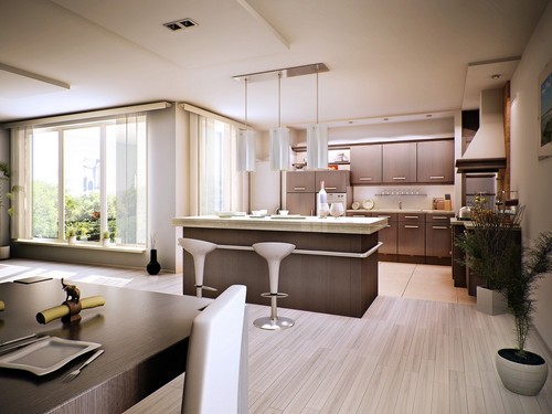 Rozwiązań, które mają rozgraniczyć przestrzeń kuchenną od gościnnej jest wiele. Sporo osób decyduje się na wmontowanie wysokiego blatu, który pełni funkcję barku i stołu jednocześnie.