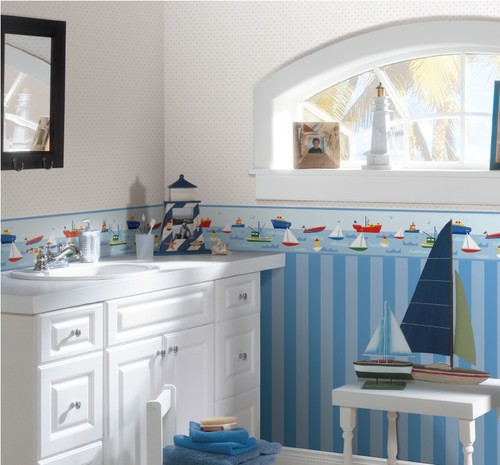 Do aranżacji w stylu marynistycznym wykorzystajmy modne, pastelowe odcienie błękitu, żółtego, czerwonego oraz kolor biały. Dzięki nim dzieci poczują w domu powiew chłodnej bryzy i przyjemne ciepło promieni słońca. Do dekoracji pomieszczenia warto dopasować tapetę w biało granatowe pasy w połączeniu z borderem w statki lub muszelki. Alternatywą może być tapeta w żaglówki, chmurki, fale lub palmy.