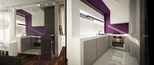 W projekcie wnętrza 85-metrowego mieszkania krakowskiej pracowni InsideLab projektanci odeszli od kolorystyki ziemi, zastępując złamane biele, beże, szarości i brązy – fioletami o różnym nasyceniu i odcieniach. Akcenty te zestawione zostały z eleganckimi bielami, ciemnym drewnem i czernią. Dominuje design nowoczesny, minimalistyczny, o prostej formie – tu jednak wzbogacony został lekkimi elementami w stylu glamour – można je dostrzec w deseniu ściany w sypialni czy formie krzeseł i lampy w salonie łączonym z kuchnią. Wnętrze to zaprojektowane zostało dla jednego z nowo budowanych ekskluzywnych osiedli w krakowskiej dzielnicy Wola Justowska.