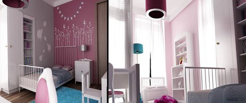Wypoczynkowy charakter pomieszczenia podkreśla wygodny fotel z podnóżkiem – klasyk designu Lounge Chair projektu Charlesa i Raya Eamesów z 1956 roku. W sypialni znalazło się także miejsce na toaletkę, którą z powodzeniem wykorzystywać można także jako miejsce do pracy. W pokoju dziecięcym dominuje biel i odcienie złamanego różu w połączeniu z turkusowymi dodatkami. Dziewczęcy charakter pokoju podkreślają rzeźbienia białych mebli oraz umieszczone na ścianach ornamenty. W niewielkim pomieszczeniu znaleziono miejsce na przestrzeń sypialno-wypoczynkową z łóżkiem, biblioteką i nocną szafką, resztę pokoju zagospodarowano łącząc funkcję przestrzeni do pracy i zabawy.
