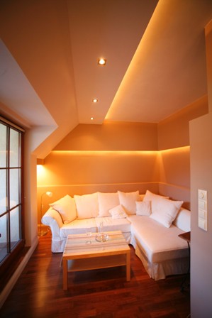"Światło diodowe może przydać się szczególnie w pomieszczeniach, w których znajduje się telewizor. Niewielkie, boczne oświetlenie jest niezbędne podczas wieczornych seansów. Wpływa bowiem pozytywnie na wzrok, poprzez eliminację kontrastu migoczącego ekranu z ciemnymi strefami pomieszczenia. - Światło LED można wykorzystać również w oświetleniu orientacyjnym na krawędziach stopni schodów, stosując np. system przewodów i profili LumiTEC" – dodaje Mariusz Gawroński. Podświetlenie domowych ciągów komunikacyjnych może stać się nie tylko ozdobą wnętrza, ale zapewnić również bezpieczne poruszanie się po zmroku.