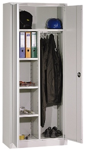 Często potrzebujemy w biurze miejsca, gdzie moglibyśmy ukryć nie tylko ubranie wierzchnie, ale także buty, dokumenty lub zapasy żywności. W takiej sytuacji sprawdzi się uniwersalna szafa socjalno-biurowa o dużej pojemności oraz podziale na: segment z drążkiem i haczykami, pionowy rząd półek oraz dodatkową półkę na górze, a wszystko to za dwuskrzydłowymi drzwiami zamykanymi na zamek z kluczykiem. Szafa będzie dobrym rozwiązaniem nie tylko w biurze, ale także na recepcji, w gabinecie lekarskim lub w sekretariacie.