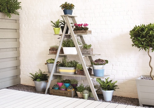 Jeśli na tarasie lub balkonie nie masz zbyt wiele miejsca, zawsze możesz zaaranżować swój ogród na ścianie, tak aby zabierał jak najmniej przestrzeni. Bardzo popularne są teraz palety, które mogą posłużyć jako część aranżacji, a drewno pomalować na wyraziste kolory, nadając wertykalnemu ogrodowi wyrazistości i osobistego charakteru. Możesz także zbić regał z desek lub kupić gotowy w sklepie. Malując go na kolor zbliżony do ściany i stawiając na nim rośliny w doniczkach, które ozdobisz kontrastowymi farbami, uzyskasz wyjątkowy efekt. Z palet przy odrobinie pracy możemy stworzyć też wygodne siedzisko czy pufę a nawet stolik – dodaj blat ze szkła i gotowe!