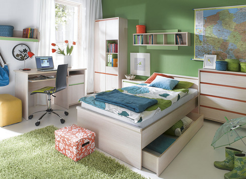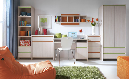Aranżacja pokoju młodzieżowego jest niezwykłym wyzwaniem. Wnętrze to musi spełniać jednocześnie kilka funkcji – to miejsce do nauki, zabawy, ale też zasłużonego odpoczynku. Dlatego warto zadbać o to, by pokój młodzieżowy był nie tylko funkcjonalny, ale współgrał również z temperamentem i osobowością nastolatka, akcentując jednocześnie jego indywidualizm i niezależność. Kolekcję Numlock tworzy 13 elementów w kolorze ‘jasnego dębu belluno’, które można aranżować na wiele sposobów. Dodatkowym atutem systemu jest dwustronna listwa ozdobna w barwach zieleni oraz pomarańczy. Można ją w prosty sposób zmieniać, w zależności od indywidualnych upodobań kolorystycznych.