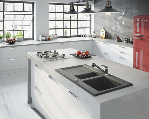 Zlewozmywak i bateria dostępne są w dwóch barwach: piaskowej i grafitowej, które doskonale korespondują z różnymi stylami aranżacji wnętrz. Komplet w kolorze piaskowym to idealna oferta dla kuchni w klimacie rustykalnym. Wspaniale prezentuje się na tle białych mebli, płytek oraz jasnego blatu przypominającego malowane deski. W połączeniu z nimi podkreśla przytulną atmosferę, spokój i bezpieczeństwo zarówno kuchni w wiejskiej posiadłości, jaki i niewielkiego mieszkania w bloku.