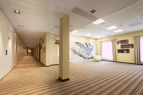 – "Projektanci budynku postawili przede wszystkim na funkcjonalność i estetykę przestrzeni, a także optymalizację kosztów użytych materiałów. Założony efekt udało się uzyskać, dzięki zastosowaniu na całej powierzchni stropów w holu wejściowym, na korytarzach i w restauracji, podwieszanych sufitów modułowych SAHARA" – wyjaśnia Sylwia Rudnicka. Wykorzystane rozwiązanie pomogło uporządkować instalacje i urządzenia serwisowe, a także uzyskać odpowiednie środowisko pod względem akustycznym. Jasna i gładka powierzchnia płyt SAHARA zapewnia ponadto wysoki poziom odbicia światła, wzmacniając oświetlenie naturalne i sztuczne oraz obniżając koszty energii.