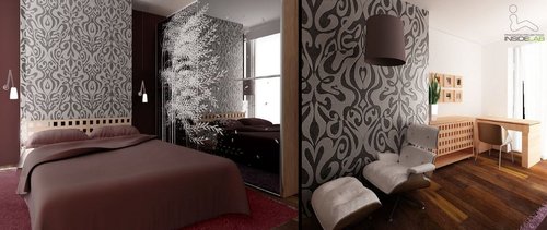 W sypialni zaobserwować można bogatszą ornamentykę – na ścianie będącej przedłużeniem wezgłowia łóżka. Zdobienie powtórzone zostało na ścianie przeciwległej. Lustro na całą wysokość ściany kryje dużą garderobę. Wypoczynkowy charakter pomieszczenia podkreśla wygodny fotel z podnóżkiem – klasyk designu Lounge Chair projektu Charlesa i Raya Eamesów z 1956 roku. W sypialni znalazło się także miejsce na toaletkę, którą z powodzeniem wykorzystywać można także jako miejsce do pracy.