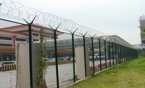 • panele Securifor na słupach Bekafix Super z podwójnymi ramionami zagiętymi i drutem żyletkowym Concertina,