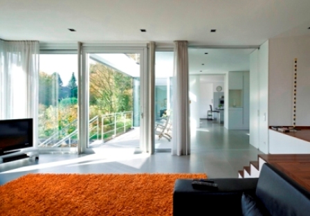 Wielkowymiarowe przeszklenia w domu jednorodzinnym w Duisburgu gwarantują maksymalny dostęp światła dziennego do pomieszczeń, harmonizują z architekturą budynku a przy tym pozwalają zaoszczędzić energię. Niezwykła trwałość aluminium oraz stabilna konstrukcja ram pozwoliła na stworzenie okien i drzwi o wymiarach sięgających nawet 2,5 x 2,8 m. Przenikające przez nie światło rozchodzi się w przestronnych jasnych pomieszczeniach o wysokości 3 metrów. Efekt jasnych przestrzeni jest potęgowany dodatkowo delikatnym kontrastem bieli i szarości oraz obecnością połyskujących, stalowych powierzchni. Otwartość architektoniczną bryły budynku podkreślają wąskie zewnętrzne szerokości profili (108 mm) w energooszczędnych drzwiach przesuwnych z serii Schϋco ASS 70. HI oraz oknach aluminiowych Schϋco AWS 75. SI.