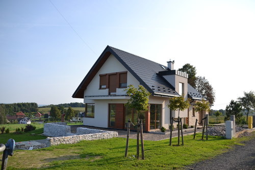 Obiekt dla rodziny 2+2 stanął na 8-arowej działce w zielonej okolicy. Inwestorzy zdecydowali się na tradycyjny dom ze skośnym dachem z połączoną z nim bryłą garażu. Wybrali projekt typowy pracowni Archon+. Są miłośnikami minimalistycznych rozwiązań, dlatego budynek nie został przeładowany detalem, ani kolorami. Wykorzystano na nim w zasadzie tylko dwie barwy – czarną na dachu i białą na elewacji. Do tego zastosowane zostały akcenty drewniane, które ocieplają wizerunek domu i stanowią ukłon w stronę rustykalnej okolicy. Na podbitce dachu pojawiło się lakierowane drewno o bursztynowej barwie, a przy okienku garażu pasek z klinkierowej cegły w podobnym kolorze. Drewniana jest także stolarka okienna i drzwi wejściowe. Do tego garaż i strefa cokołowa pokryte zostały okładziną imitującą układany warstwowo piaskowiec.