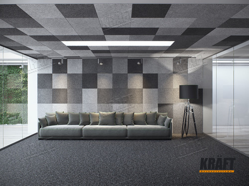 Najprostszym sposobem na dodanie koloru do sufitu jest użycie płyt akustycznych KRAFT WoodAcoustic. Można je pomalować na dowolny kolor. System podwieszany KRAFT Fortis może być również pomalowany na wybrany kolor lub użyty jako element kontrastowy do podziału sufitu na kwadraty lub prostokąty.