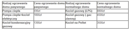 Bardzo ważne jest położenie domu oraz jego oszklenie. Ulokowanie okien od strony południowej oznacza, że promienie słoneczne docierające do naszego wnętrza zredukują tradycyjne ogrzewanie. Jak już wcześniej wspomniano, kluczowa jest też szczelna izolacja, to dzięki niej w przyszłości możemy zaoszczędzić na ogrzewaniu. Drugim aspektem jest wentylacja mechaniczna z odzyskaniem ciepła we wszystkich pomieszczeniach, dzięki temu mamy jednakową temperaturę w całym budynku. Dodatkowo dzięki temu rozwiązaniu mamy zapewnione czyste powietrze przez cały rok, niezależnie od pogody. W takim domu pasywnym nie zaznamy tradycyjnego ogrzewania węglem czy olejem opałowym. Standardem nowoczesnego ekologicznego domu są pompy ciepła, kotły elektryczne oraz kotły kondensacyjne gazowe. Aby porównać ceny rocznego ogrzewania domu pasywnego z cenami ogrzewania standardowych budynków, zapraszam do tabelki poniżej.