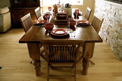 Artystyczny indywidualizm w zestawieniu z domowym pragmatyzmem widoczne są również w designie gotowych, stworzonych w pracowni Table Top, stołów. Wykonany z litej sosny bezsęcznej solidny i obszerny blat (długość: 250 cm, szerokość: 110 cm, grubość: 4 cm) zapewnia optymalne warunki dla spotykania się w gronie nawet 8 osób. Powierzchnia pomalowana jest wysokiej klasy bejcą olejną i lakierem poliuretanowym na kolor drewna tekowego. Przykręcane u nasady nogi to kolejny wyznacznik solidności, a jednocześnie okazja do nadania konstrukcji bardziej osobistego charakteru. Nogi „proste” powstały z jednego kloca drewna świerkowego i charakteryzują się pięknymi, naturalnymi pęknięciami, dającymi niepowtarzalny efekt postarzania. Każda waży 6,5 kg. Natomiast z sosny klejonej zrobiono nogi toczone (waga: ok. 5 kg), których zaokrąglone kształty wprowadzają nutkę lekkości do tej stabilnej podstawy.