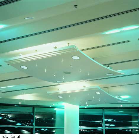 Przy projektowaniu pomieszczenia należy pamiętać, że podstawowe znaczenie we wnętrzu odgrywa oświetlenie górne, sufitowe, którego zadaniem jest zapewnienie dobrego widzenia w każdej strefie pomieszczenia. Systemy sufitowe firmy Knauf dają możliwość zastosowania różnorodnego źródła światła. Oświetlenie montowane w oprawach wbudowanych w sufit lub tuż pod nim, przylegając do jego płaszczyzny, oprawy wiszące o dekoracyjnych formach i zróżnicowanej kolorystyce, lampy wbudowane w sufit, możliwości jest wiele. Poprzez odpowiednią, dekoracyjną oprawę oświetleniową z każdego, nawet wyjątkowo nieatrakcyjnego pomieszczenia, można wydobyć odpowiedni, pożądany przez nas, stylowy nastrój.