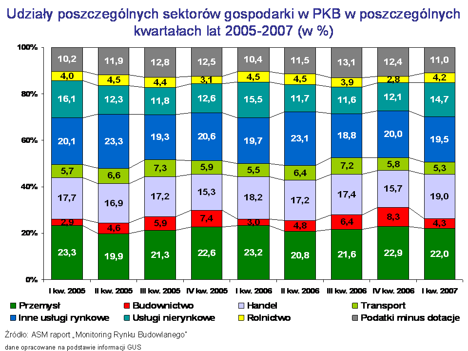 Udziały poszczególnych sektorów gospodarki w PKB w poszczególnych kwartałach lat 2005-2007 (w %)