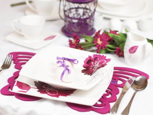 Niezależnie od tego czy stół wielkanocny ubierzemy w pastelowe kolory, czy zdecydujemy się na bardziej nasycone barwy, ważne jest by nawiązywał do świeżości, jaką niosą ze sobą wiosenne, słoneczne dni. Ciekawym rozwiązaniem może okazać się wzorzysta zastawa, np. z przyciągającym oko wzorem kwiatowym w kolorze fioletowym. Nie należy zapomnieć o detalach – mogą to być kwiaty, słoneczny świecznik z motywem florystycznym lub podkładka filcowa w kształcie motyla. Smacznym pomysłem może być też ubranie świątecznych jajek – obwiązanych atłasową kokardą lub pomalowanych na jeden, mocny kolor nawiązujący do motywu przewodniego, jaki obowiązywać będzie na naszym wielkanocnym stole.
