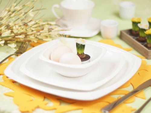 Jasne, słoneczne kolory to domena wiosennych dni. Świąteczne śniadanie można zatem podać na stole, którego motywem przewodnim będzie klasyka - świeża zieleń oraz kanarkowa bądź soczysta żółć. To idealny duet, który zachęci do biesiadowania wprowadzając jednocześnie ciepłą, rodzinną atmosferę. Wykorzystując dodatki (takie jak: obrus, serwetki, podkładki filcowe i inne ozdoby) w mocnych, żółtych kolorach, najlepiej zdecydować się na białą, klasyczną zastawę. Eleganckim uzupełnieniem, a zarazem niezwykle oryginalną ozdobą mogą być świeczki kwiatowe w słonecznym kolorze, jak np. żółte krokusy w małych doniczkach.