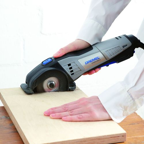 Używając piły ręcznej Dremel DSM20 i uniwersalnej węglikowej tarczy tnącej (DSM500), wytnij drewniane elementy w odpowiednich kształtach. Aby uzyskać równe i gładkie cięcia elementów blaszanych, załóż tarczę do cięcia metalu ( DSM510).
