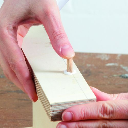 Zmontuj pozostałe drewniane części półki – z wyjątkiem dwóch górnych wsporników – i dopasowując wywiercone otwory do części spodniej, zrób w niej analogiczne nawiercenia. Teraz umocuj poszczególne elementy za pomocą kleju i kołków. Po wyschnięciu kleju pomaluj półkę białą akrylową farbą.