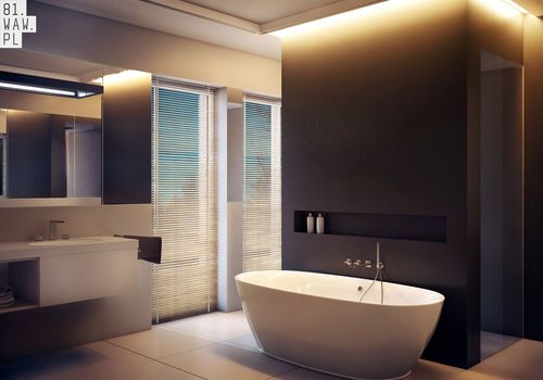 Główne oświetlenie na suficie stanowią kartonowe lampy, które łagodzą surowy charakter pomieszczenia. Łazienka przy głównej sypialni zlokalizowana została za ścianą z biokominkiem. To jednolita przestrzeń z wolno stojącą wanną oraz prysznicem, oddzielonymi ścianką działową, w której wykuto półki służące jako regał na przybory kąpielowe. Posadzka prysznica jest przedłużeniem podłogi w całej łazience, dzięki czemu jest on całkowicie niewidoczny. Umywalkę umieszczono w prostopadłościennej zabudowie meblowej, którą podzielono na dwie części - w jednej mieści się szuflada, a druga to półka na ręczniki. W wystroju drugiej sypialni, znajdującej się na piętrze, dominują elementy poziome. Zagłówek łóżka to ściana wykonana z paneli wykończonych lakierem półmatowym w kolorze szarym, w które zostały wpisane kreski – oświetlenie LED klimatycznie doświetlające pomieszczenie. Podobnie jak w sypialni głównej, vis-a-vis łóżka znajduje się biokominek z analogiczną ścianą, jak zagłówek łóżka i poziome oświetlenie. Głównym oświetleniem sufitowym są lampy imitujące lewitujące, świecące patyczki, które współgrają z resztą oświetlenia pokoju. W łazience przy sypialni zastosowano konsekwentne podobne rozwiązanie, jak w sypialni i na jednej ze ścian wbudowano w zabudowę poziome świecące linie. Umywalka jest lekkim nablatowym meblem, który postawiono na kamiennym blacie. Duże lustro powiększa optycznie przestrzeń. Wnękę z prysznicem podkreślono ciemnoszarą płytką i oddzielono dużą szklaną taflą od reszty łazienki.