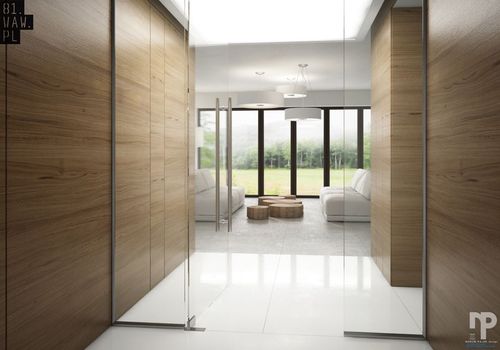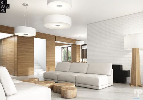 Wystrój został utrzymany w stonowanej kolorystyce – dominuje biel złamana drewnem oraz elementami betonowych wykończeń. Gości wita przestronny hol w drewnie, który został odseparowany od reszty pomieszczeń szklaną ścianą z drzwiami z tego samego materiału, rozciągającą się na wysokość całego pomieszczenia. W tej części domu zlokalizowano także szafy wnękowe oraz wejście do pomieszczenia technicznego, ukryte dyskretnie za drewnianymi frontami. Podłoga to jasna posadzka z twardego i trwałego konglomeratu, która doskonale sprawdza się w takich pomieszczeniach. Główne źródło światła w holu stanowią diody typu LED, podświetlające napinany sufit. Koniec korytarza wyznacza panoramiczne okno z widokiem na pobliski las. Pokój dzienny to przestrzeń z białymi ścianami, które zostały wykończone cegłą pomalowaną w tym samym kolorze. Jasnoszarą posadzkę z płyt gresowych ocieplono przez wstawienie do wnętrza drewnianych akcentów: funkcję stolików kawowych pełnią pnie drzew w różnych rozmiarach, wystrój dopełniają stojące lampy na drewnianych nogach z białymi, okrągłymi abażurami. Dodatkowe źródło oświetlenia stanowią okrągłe lampy podwieszone na różnych wysokościach. W salonie znalazł się również wtopiony w ceglany mur granitowy kominek, z miejscem na składowanie drewna.