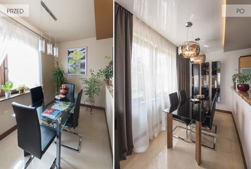 Agnieszka Liniewska-Baran: Tworzenie nowych przestrzeni faktycznie sprawia mi ogromną przyjemność, pozwala kreować inną rzeczywistość, badać granice i przełamywać utarte schematy. Pani Monika i inni domownicy również byli bardzo entuzjastycznie nastawieni do zmian, choć początkowo podchodzili do nich z pewną rezerwą. Stworzyli już bowiem dom, w którym wszystkie przedmioty zdołały znaleźć swoje utarte miejsce, stanowiły też integralną część wspomnień rodzinnych. Opracowaliśmy więc wspólnie koncepcję aranżacji, zastanawiając się co przerobić, co zostawić, a czym zaskoczyć. Dobrze zaprojektowane wnętrze jest bowiem miejscem, które jest nie tylko piękne i funkcjonalne, ale przede wszystkim odzwierciedla potrzeby oraz charakter właścicieli. W domu pani Moniki metamorfozie ulec miał parter domu, czyli salon wypoczynkowy oraz jadalnia. Przed metamorfozą wystrój był tu przypadkowy, jednak panował w nim nastrój domowego ciepła i spokoju, co zainspirowało nas do stworzenia wnętrza harmonijnego i eleganckiego. Właścicielom zależało, aby wnętrze było nadal rodzinne, ciepłe i niezbyt nowoczesne, ale z atutami płynącymi z wykorzystania materiałów najnowszej generacji o wysokiej jakości. Zasadą w projektowaniu dobrych wnętrz jest, że im mniej tym lepiej. Salon łatwo jest zagracić zbędnymi tekstyliami, złym doborem kolorystyki mebli i ścian, nagromadzeniem różnobarwnych przedmiotów, detali wzorów i faktur. Metamorfoza domu pani Moniki polegała przede wszystkim na uporządkowaniu wnętrza i dodaniu mu 'oddechu'.