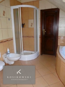 Łazienka o powierzchni 12m2 ściany i podłoga płytki ceramiczne, wanna narożna, WC, zabudowana umywalka z tego pomieszczenia przejście do pralni o pow. 11m2.
