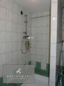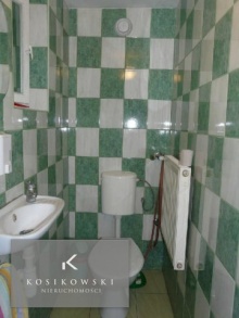 Kolejne dwa pomieszczenia to łazienka o powierzchni ok. 6 m2 i toaleta ok. 2 m2, które zostały przez właścicieli odnowione, wyremontowane. W pierwszym z nich znajduje się prysznic oraz brojler. Cała powierzchnia łazienki została wykafelkowana, co nadaje komfortowego wyglądu. W drugim pomieszczeniu znajduje się toaleta i umywalka. Na ścianach i podłodze położono białe oraz zielone płytki ceramiczne tworzące nowoczesny wzór.
