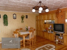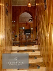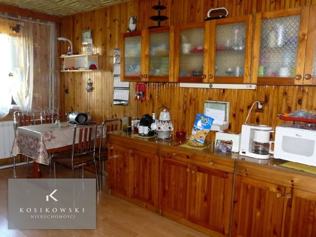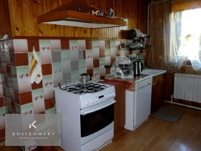 Kuchnia jest duża i funkcjonalna, zajmuje powierzchnię ok. 14 m2. Na jednej ze ścian do połowy wysokości położono kafle, pozostałe pokrywa boazeria. Podłogę pokryto wysokiej jakości panelami. W wyposażeniu tego pomieszczenia pozostają meble, kuchenka z piekarnikiem, okap, zlewozmywak, stół oraz krzesła. Z kuchni można przejść do spiżarki - ok. 3m2, w której znajdują się regały oraz zamrażarka. Jest to miejsce, w którym można przechowywać najpotrzebniejsze rzeczy lub przetwory.