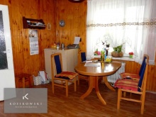 W kuchni o powierzchni ok. 18m2 ściany pokryto drewnianą boazerią. Kuchnię o takich wymiarach, można z łatwością zaaranżować na rodzinną jadalnię.