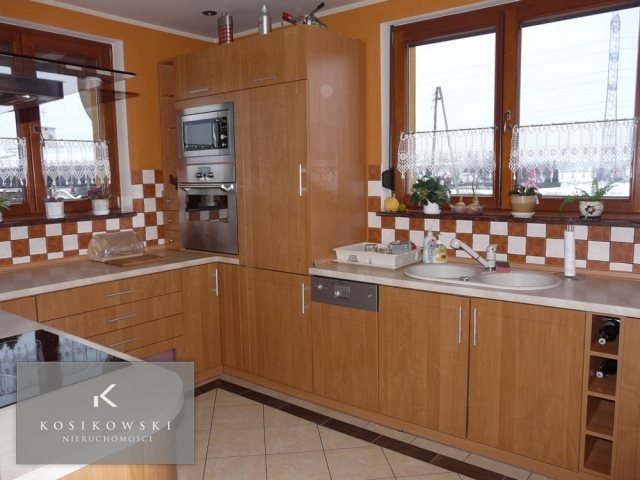Kuchnia o powierzchni ok. 11 m2 jest bardzo funkcjonalna. Znajdują się w niej meble kuchenne wykonane na indywidualne zamówienie, lodówka, zmywarka, zlewozmywak, mikrofalówka, piekarnik oraz płyta elektryczna. Wyposażenie kuchni wliczone jest w cenę nieruchomości. Podłoga wykonana jest z wysokiej klasy płytek ceramicznych a na ścianach widnieje tynk tradycyjny w żółtym kolorze oraz płytki ceramiczne biało-brązowe. W tym pomieszczeniu znajduje się również duże okno.