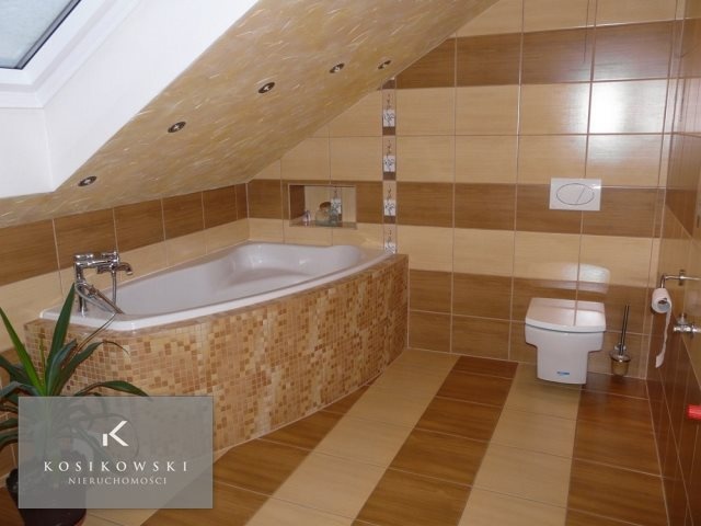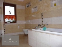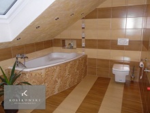 Łazienka o powierzchni ok. 4 m2 jest przestronna i stylowa. W wyposażeniu znajduje się wanna, umywalka oraz WC. Całość pomieszczenia pokryta jest płytkami ceramicznymi w ciepłym kolorze, który sprawia że pomieszczenie jest bardzo przytulne.