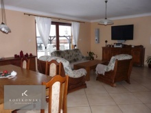 Z kuchni przechodzimy do dużego pokoju dziennego o powierzchni ok. 40 m2 połączonego razem z jadalnią. W centralnej części tego pokoju znajduje się kominek, który daje ciepło i niepowtarzalny klimat całemu pomieszczeniu a nadmuch ciepłego powietrza rozprowadzony pomieszczeniu. Na podłodze położono jasnobeżowe kafelki, na ścianach gładź pomalowana w jasnym kolorze. Pokój dzienny połączono z tarasem rekreacyjnym, na który przechodzimy przez dwuskrzydłowe drzwi balkonowe. W okresie letnim powiększa funkcję parteru i daje możliwość wypoczynku na świeżym powietrzu we własnym ogrodzie.