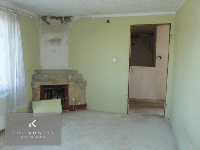 Następny pokój zajmuje powierzchnię ok. 14 m2. Ściany pokryto tradycyjnym tynkiem, a na podłodze wykonano wylewkę betonową. W pomieszczeniu tym znajduje się duże, drewniane okno oraz drzwi, przez które można przejść na działkę otaczającą całą nieruchomość.