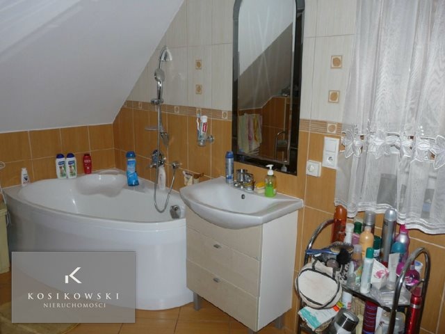 Na piętro prowadzą drewniane schody. Na tym poziome znajdują się 3 pokoje. Dwa większe o powierzchni ok. 14 m2 z zamontowanymi szafami wnękowymi, natomiast mniejszy o powierzchni ok. 12 m2. Na piętrze mieści się gustowna łazienka z zamontowaną kabiną prysznicową, wanną, WC i umywalką. Ponadto nad 1 piętrem znajduję się przestronne poddasze pełniące funkcję magazynku, przechowalni rzeczy, których w każdym domu jest sporo.