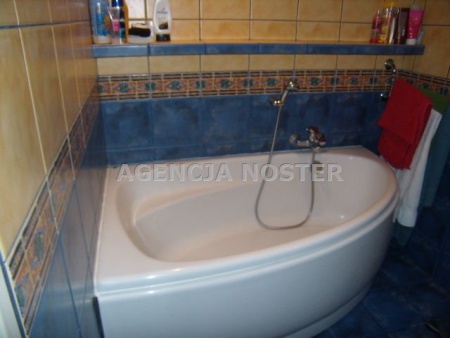 W wymienionych pomieszczeniach na posadzce betonowej położono wykładzinę dywanową, ściany otynkowano i wymalowano na różne kolory. Ponadto na piętrze znajdują się dwie wyremontowane w ostatnim czasie łazienki: mniejsza 5m2 wyposażona w umywalkę, pralkę oraz prysznic z hydromasażem oraz większa 6,2m2 wyposażona w wannę ok. 1,60m, ubikacje i umywalkę. W obydwóch łazienkach są okna, podłogi oraz ściany wyłożone płytkami ceramicznymi. Częściowo wzdłuż zachodniej ściany budynku, wybudowano balkon o powierzchni ok.7m2. Zarówno taras jak i balkon okalają kute, malowane na czarno balustrady.