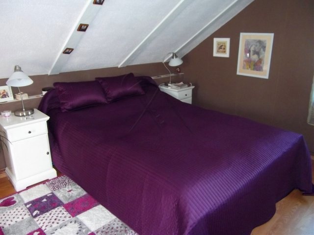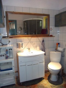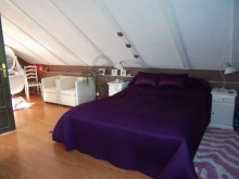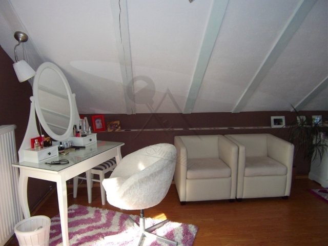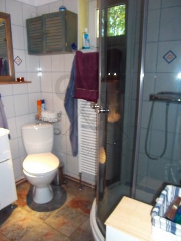 Łazienka o powierzchni 3,8m2 z prysznicem oraz WC. Ściany i podłoga pokryte płytkami ceramicznymi. Schody drewniane. Na poddaszu znajduje się jeden duży pokój i garderoba. Ściany malowane farbami emulsyjnymi. Na podłodze panele.