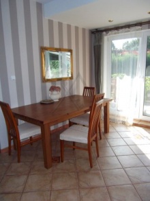 Na parterze znajdują się 3 pokoje o powierzchni, 14m2, 12,4m2 i 8,80 m2, jadalna z kuchnią. Kuchnia w pełni umeblowana i wyposażona. Ściany tapetowane. Na podłodze wysokiej klasy płytki.