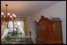 Na podłodze korytarza oraz wiatrołapu położono płytki ceramiczne, ściany pokryto gładzią gipsową i pomalowano. Tuż za wiatrołapem znajduje się korytarz, z którego jest wejście po prawej stronie do kuchni, po lewej do łazienki i na wprost do salonu. Salon wykończono kładąc na podłodze deski podłogowe, a ściany pokryto gładzią gipsową i pomalowano na jasny kolor. W salonie znajduje się kominek. Kuchnia jest otwarta, jasna, przestronna, funkcjonalna. Na podłodze położono płytki ceramiczne, ściany pokryto gładzią gipsową i pomalowano. Salon i kuchnia są połączone ozdobnym przejściem łukowym. Łazienka z oknem. Na podłodze oraz ścianach do ok. ½ wysokości położono płytki ceramiczne, ściany powyżej pokryto gładzią gipsową i pomalowano. Z salonu drewniane schody, zdobione kutymi poręczami prowadzą na piętro domu.