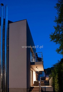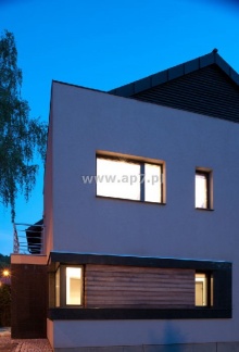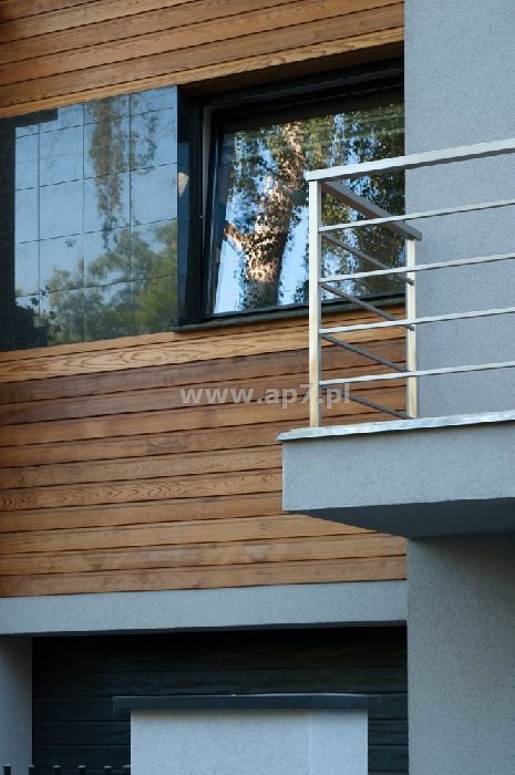 Okna aluminiowe. Na parterze duży taras, na piętrze dwa balkony.