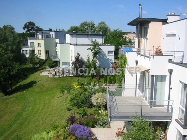 Do wynajęcia przestronny segment na zamkniętym osiedlu w lesie z prywatnym jeziorkiem. Sąsiedztwo pałacu Brühla. Osiedle wielokrotnie nagradzane w konkursach architektonicznych. Salon z bezpośrednim zejściem do garażu i wyjściem do ogrodu, widok na jeziorko. Wokół cisza i spokój, dojazd do centrum znakomity. Obszerny salon połączony z kuchnią i jadalnią. Na pierwszym piętrze 4 sypialnie i 2 łazienki. W cenie 2 miejsca garażowe. Możliwość wystawiania faktur.
