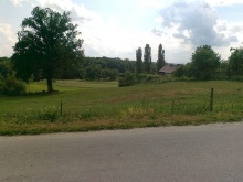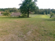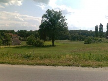 Działka w kształcie kielicha położona częściowo na delikatnym zboczu o szerokości: wzdłuż drogi asfaltowej 55m, poniżej dębu 18m.