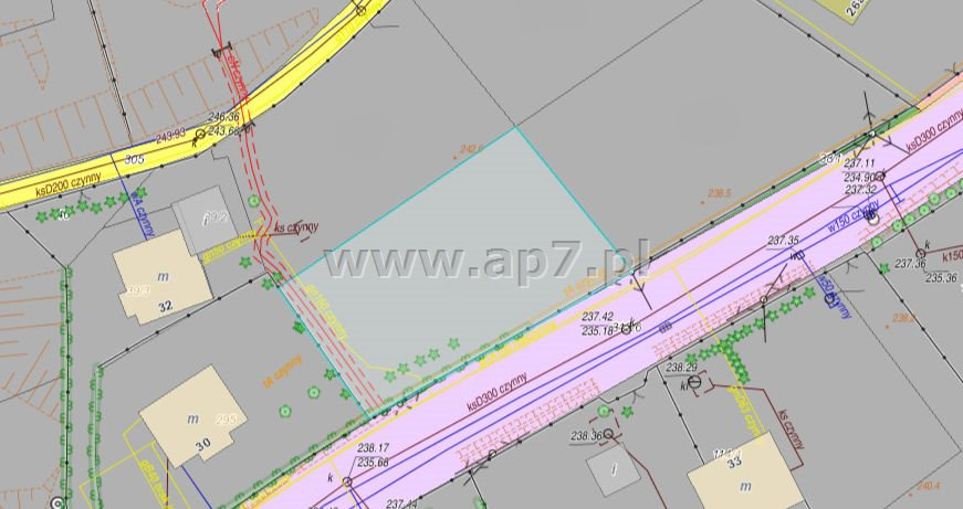 Działka jest budowlana, lekko nachylona, w kształcie regularnego prostokąta. Znajduje się tuż przy głównej ulicy. Wymiary 22x35m. (dłuższy bok od drogi). Ogrodzenie wzdłuż drogi.