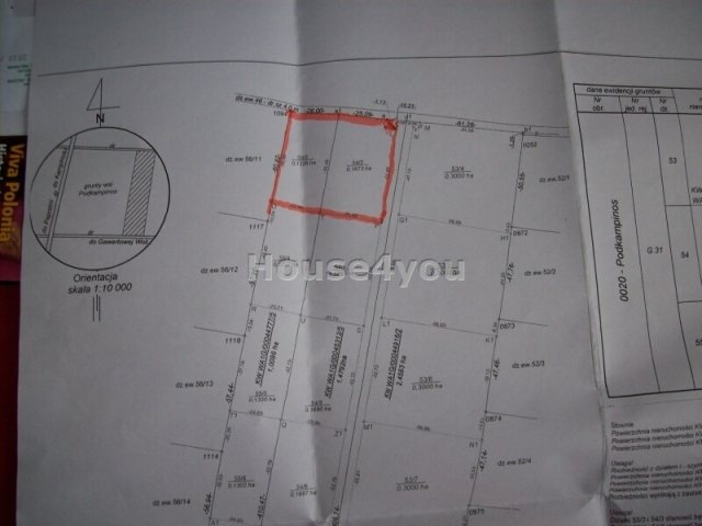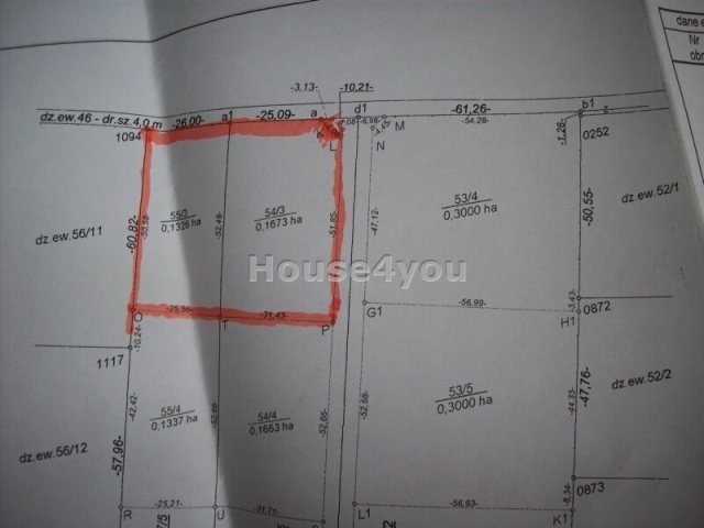Działki 3000mkw (kilkanaście sztuk) powstałe w wyniku podziału 5ha terenu; pośrodku działki utworzona została 8m droga wewnętrzna a po jej obu stronach utworzone zostały działki po 3000mkw.